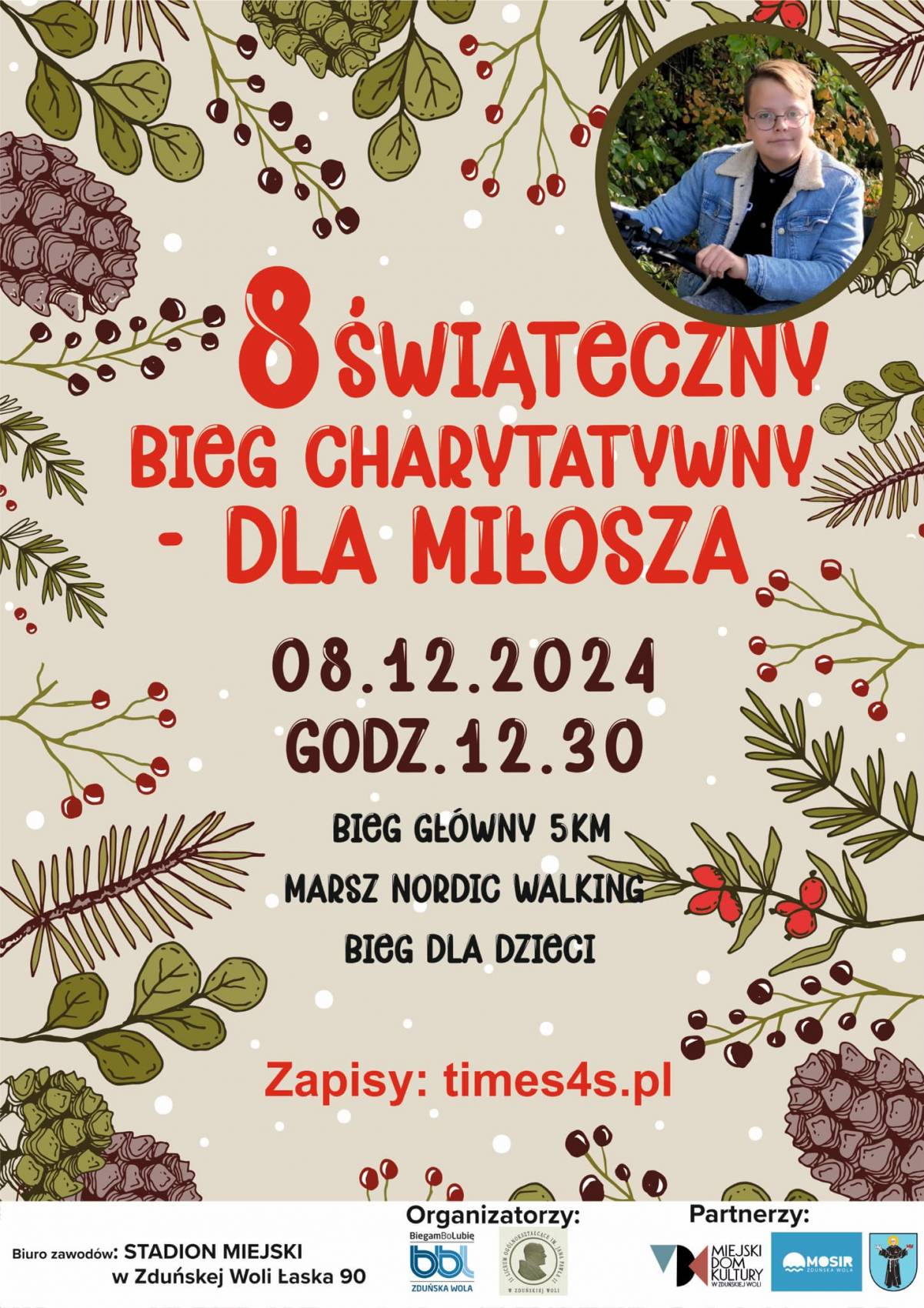 Ósma edycja Świątecznego Biegu Charytatywnego organizowanego przez stowarzyszenie Biegam Bo Lubię Zduńska Wola oraz II Liceum Ogólnokształcące w Zduńskiej Woli odbędzie się w niedzielę, 8 grudnia. W tym roku celem wydarzenia jest zebranie pieniędzy na rehabilitację dla Miłosza Szyi, który w wieku 4 lat przeszedł zapalenie rdzenia kręgowego, co spowodowało zanik mięśni i liczne przykurcze, w wyniku czego przestał chodzić, porusza się na wózku inwalidzkim. Obecnie Miłosz ma 12 lat.