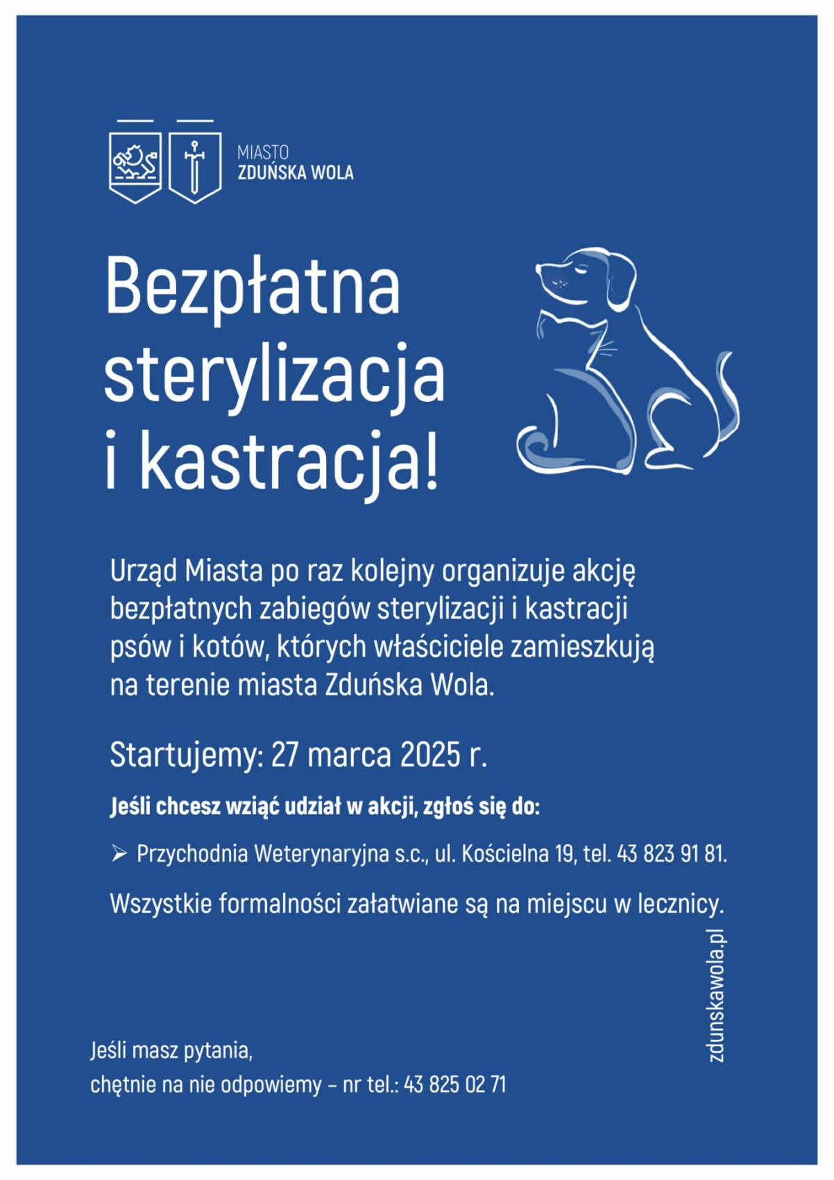 Od czwartku, 27 marca 2025 roku rozpoczyna się w Zduńskiej Woli akcja bezpłatnej sterylizacji i kastracji zwierząt. Mogą z niej skorzystać właściciele psów i kotów mieszkający na terenie miasta.