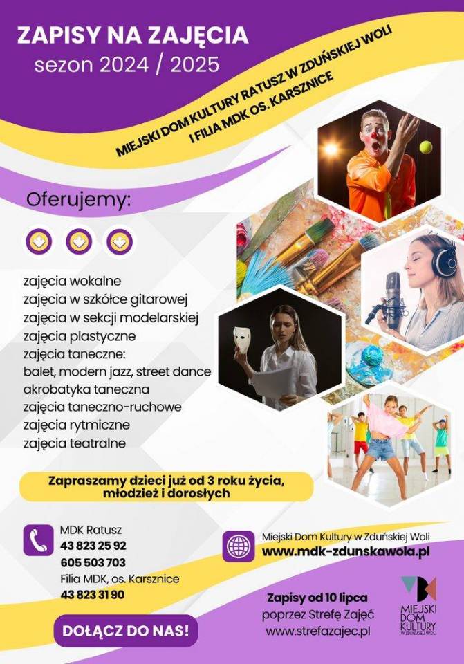 Zajęcia poprowadzi Michał Makulski – pianista, kompozytor, aranżer, muzykoterapeuta. Absolwent Akademii Muzycznej im. Karola Szymanowskiego w Katowicach. Autor muzyki teatralnej i filmowej. Pożegnanie wakacji w KarsznicachNa pożegnanie wakacji na osiedlu Karsznice w piątek, 30 sierpnia, będzie disco pod gołym niebem. Zabawa odbędzie się na terenie parkingu przy filii Miejskiego Domu Kultury na osiedlu Karsznice w Zduńskiej Woli przy ul. Stefana Okrzei.