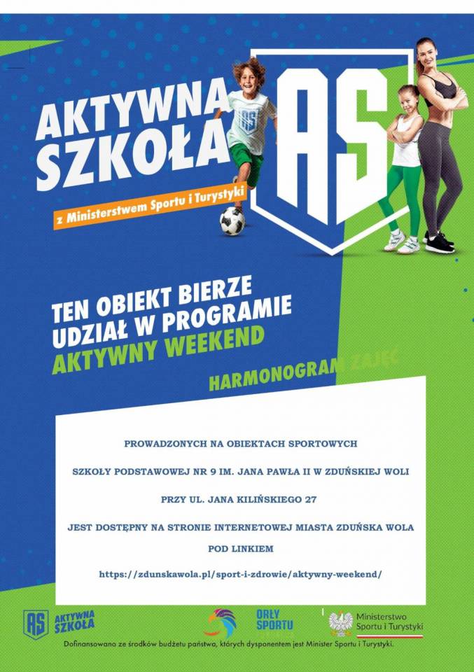 Aktywny weekend w Zduńskiej WoliW sierpniu w Zduńskiej Woli mieszkańcy mogą uczestniczyć w programie pod nazwą „Aktywny Weekend", który polega na organizowaniu ogólnodostępnych i bezpłatnych zajęć sportowych dla mieszkańców miasta w obiektach sportowych Szkoły Podstawowej nr 9 z Oddziałami Integracyjnymi im. Jana Pawła II w Zduńskiej Woli przy ul. Jana Kilińskiego 27.