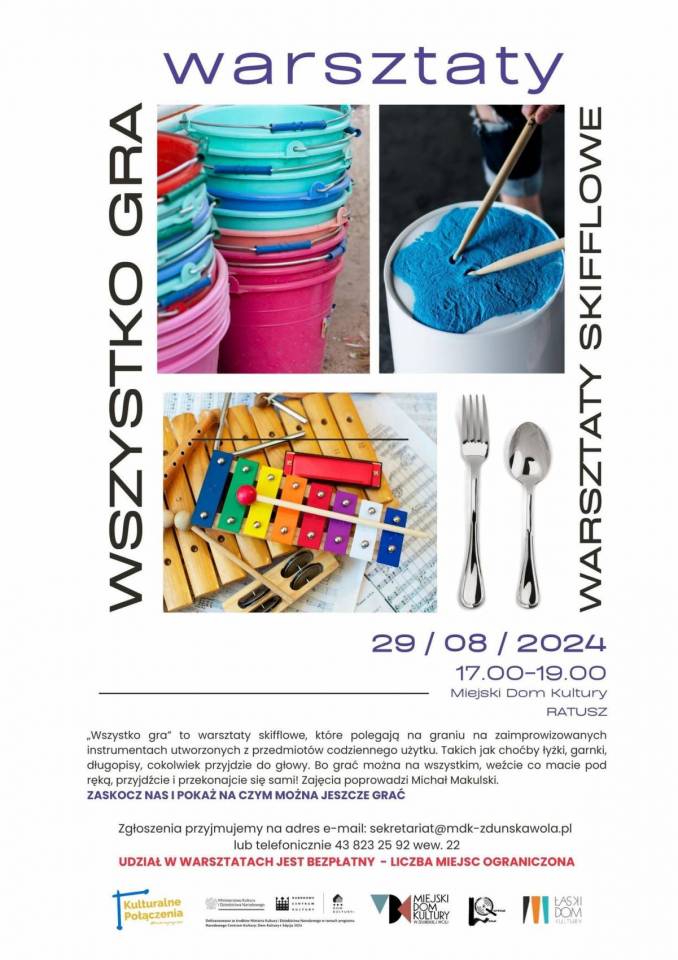 „Wszystko gra" to warsztaty skifflowe, które polegają na graniu na zaimprowizowanych instrumentach utworzonych z przedmiotów codziennego użytku. Takich jak choćby garnki, czy cokolwiek, co przyjdzie do głowy. – Weźcie co macie pod ręką, przyjdźcie i przekonajcie się sami – zachęcają organizatorzy.