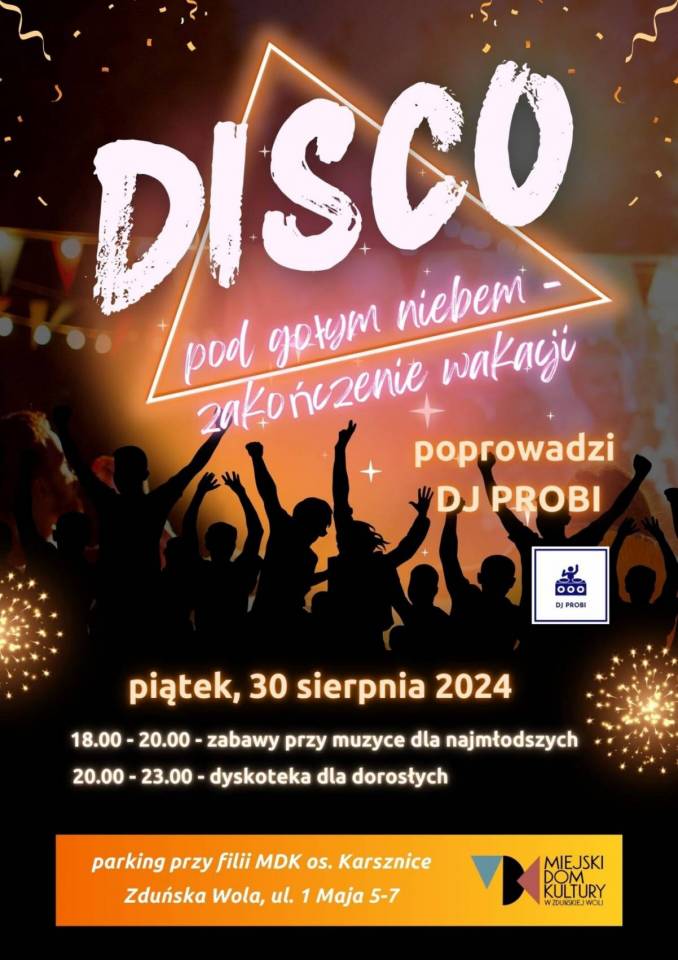 Disco pod gołym niebem na zakończenie wakacji poprowadzi DJ PROBI. Od godz. 18 do godz. 20 będzie zabawy przy muzyce dla najmłodszych, natomiast od godz. 20 do godz. 23 trwać będzie dyskoteka dla dorosłych.