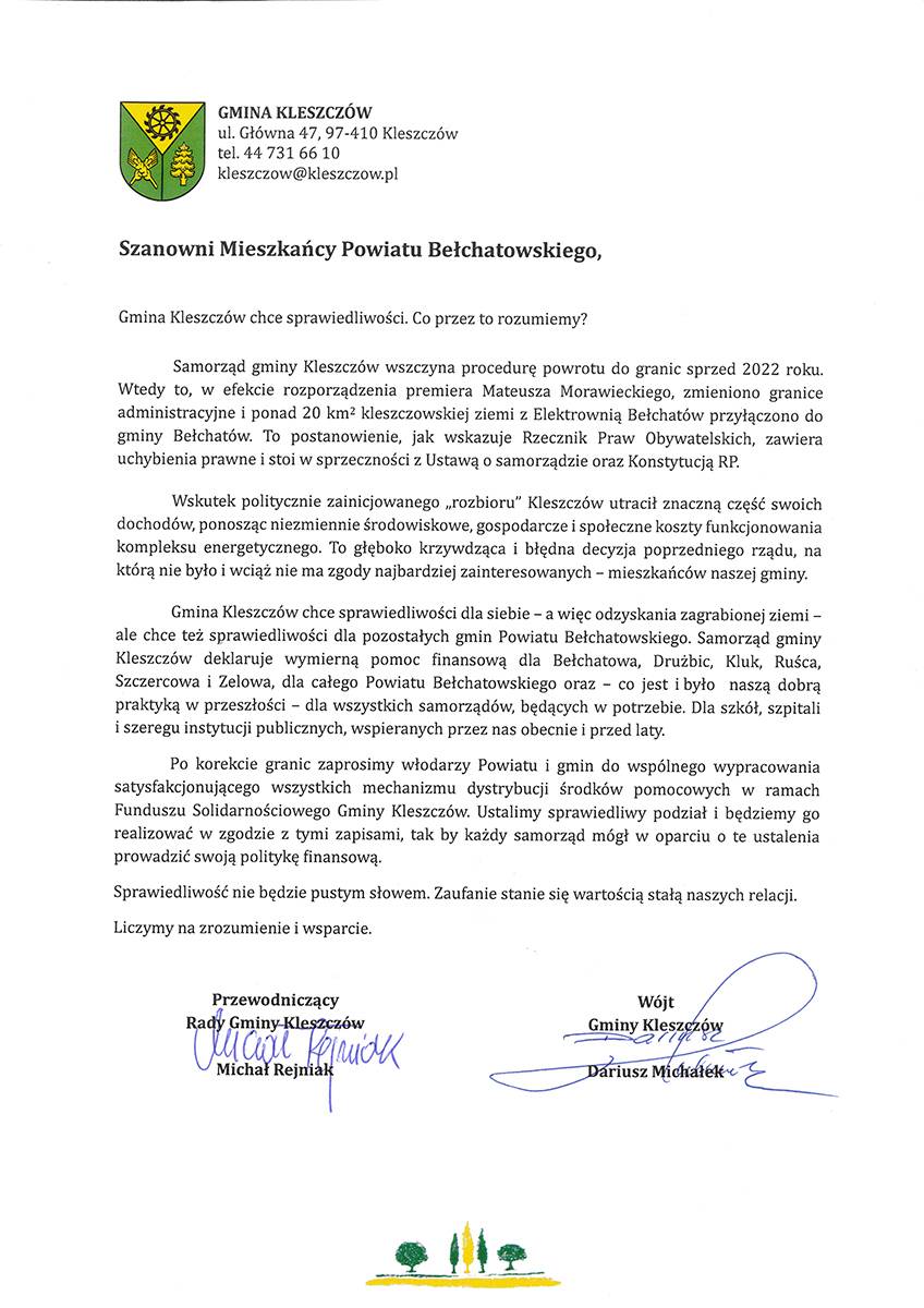 Poniżej znajduje się skan pisma skierowanego przez Wójta Gminy Kleszczów Dariusza Michałka oraz Przewodniczącego Rady Gminy Michała Rejniaka do mieszkańców powiatu bełchatowskiego: