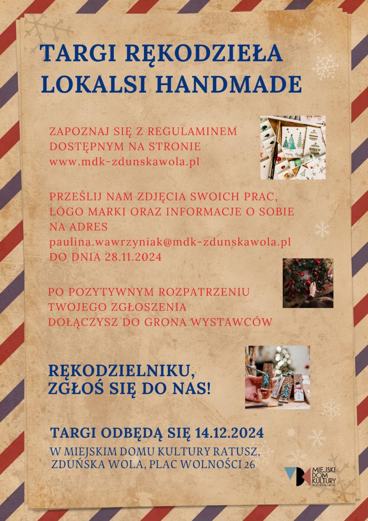 Informacje o zgłoszeniach i karta zgłoszenia dostępna na stronie Miejskiego Domu Kultury Ratusz https://www.mdk-zdunskawola.pl/lokalsi-handmade-2024/
