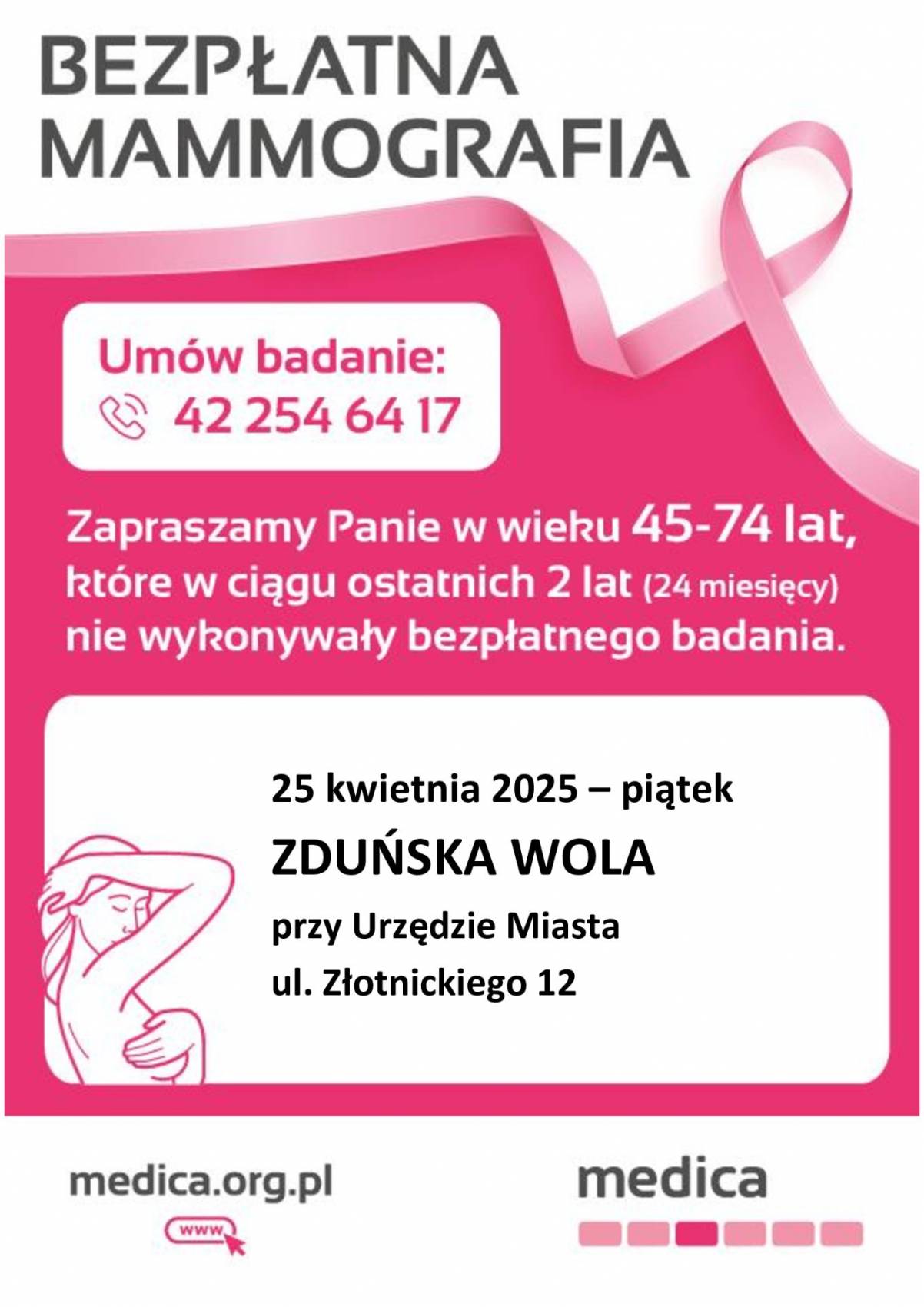 Zapisy na mammografię prowadzone są pod numerem telefonu 42 254 64 17 oraz przez Internet na stronie medica.org.pl.