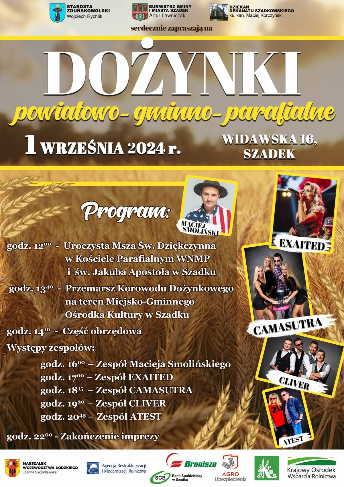 Dożynki rozpoczną się o godzinie 12:00 uroczystą Mszą Świętą w Kościele WNMP i św. Jakuba Apostoła w Szadku. Podczas której mieszkańcy podziękują za tegoroczne plony. Po mszy, mieszkańcy i goście wezmą udział w barwnym korowodzie dożynkowym, który przemaszeruje przez główne ulice Szadku. Korowód, pełen tradycyjnych strojów ludowych, pięknie ozdobionych wozów i wieńców dożynkowych, symbolizować będzie bogactwo ziemi i dumną pracę rolników.