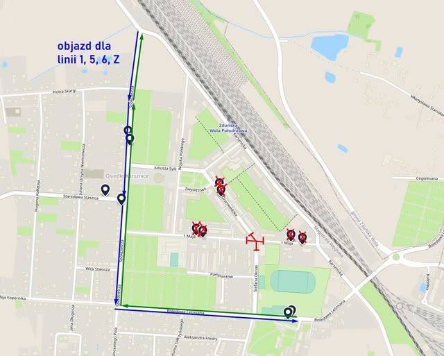 W związku z pracami od poniedziałku, 3 listopada 2025 roku autobusy MPK linii nr 1, 5, Z oraz 6 będą kursować objazdem ulicami Spółdzielczą oraz Bolesława Leśmiana. Przystanki na ul. 1 Maja oraz Grunwaldzkiej zostaną tymczasowo wyłączone z obsługi pasażerów.