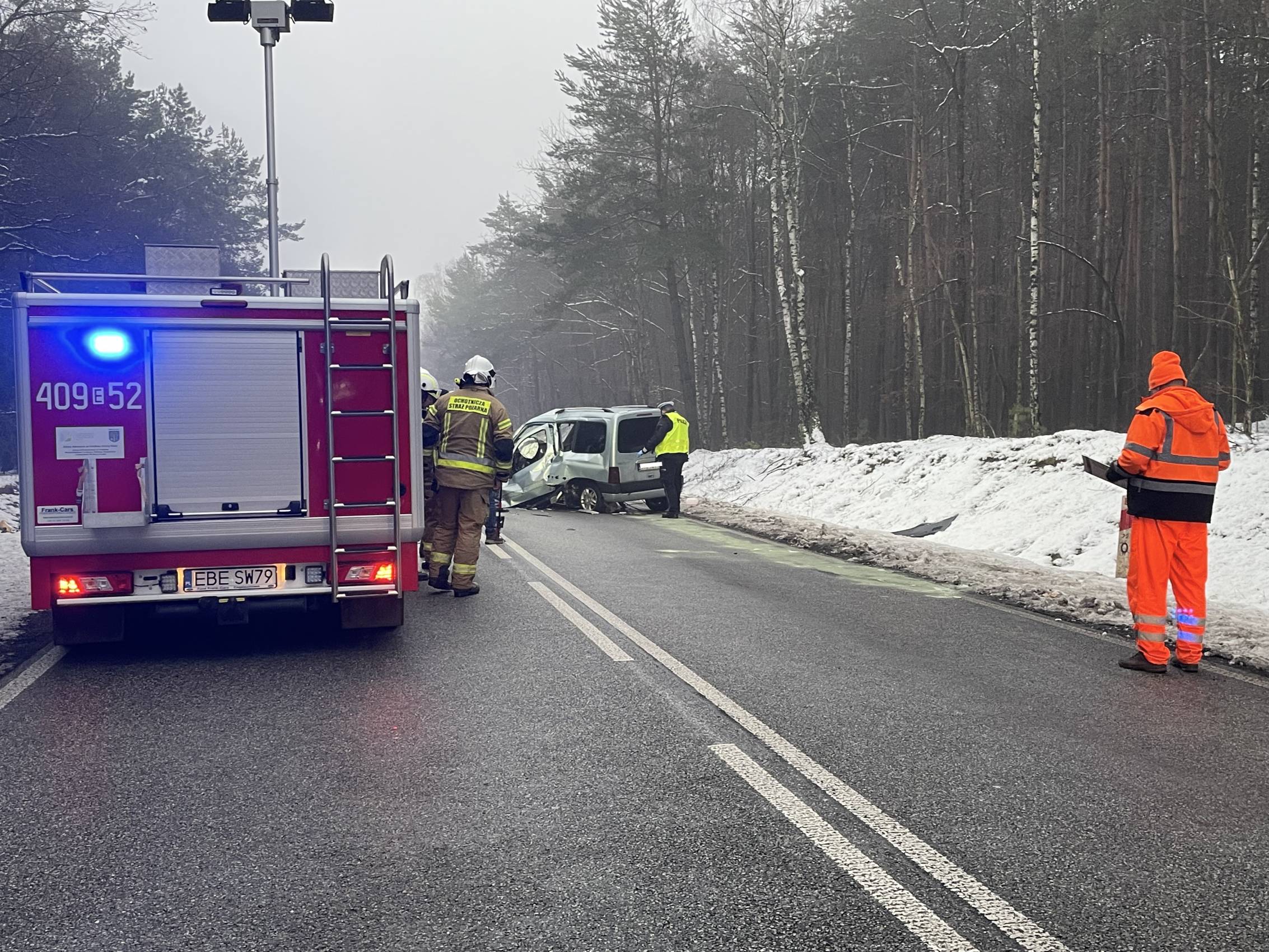 Na miejscu pracują policjanci, strażacy oraz prokurator, którzy ustalają dokładne okoliczności zdarzenia. Droga krajowa pozostaje całkowicie zablokowana, a utrudnienia mogą potrwać jeszcze około dwóch godzin.