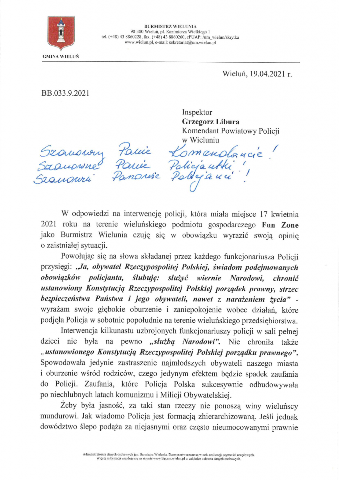 Burmistrz Wielunia, Paweł Okrasa skierował list otwarty do Komendanta Powiatowego Policji w Wieluniu, który jest odpowiedzią na interwencję policji w lokalnej sali zabaw.