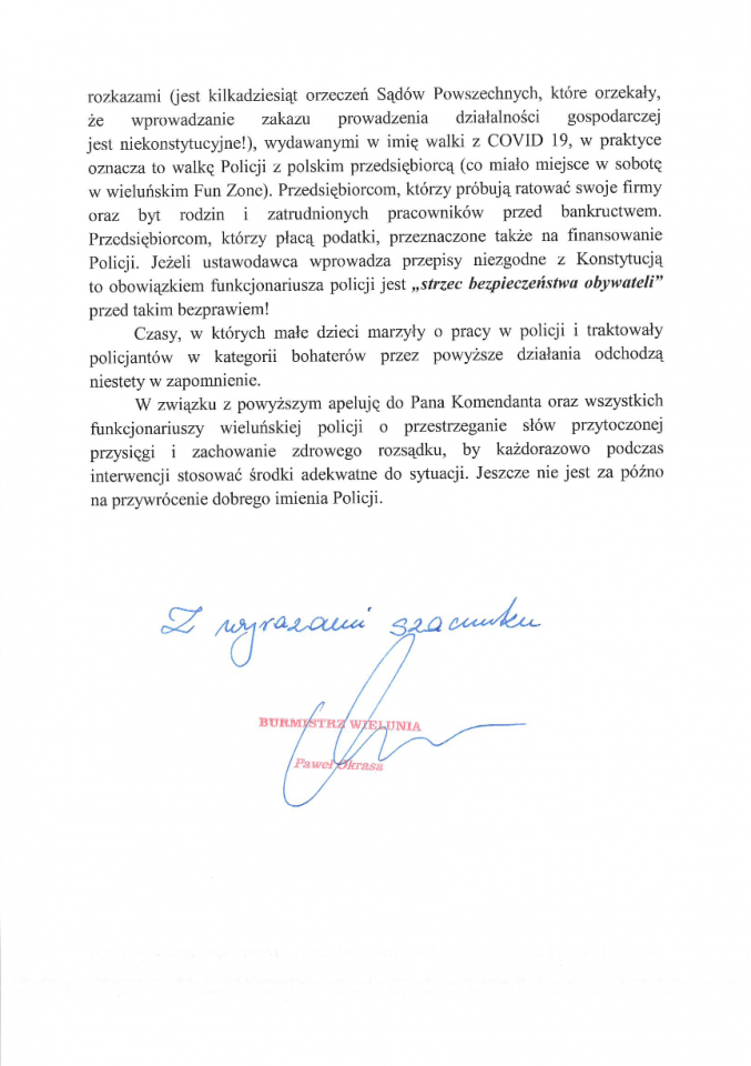 Burmistrz Wielunia nie wizy za te działania wieluńskich policjantów, a "dowództwo, które ślepo podąża za niejasnymi oraz często nieumocowanymi prawnie rozkazami, wydawanymi w imię walki z COVID-19, co w praktyce oznacza oznacza walkę Policji z polski przedsiębiorcą".