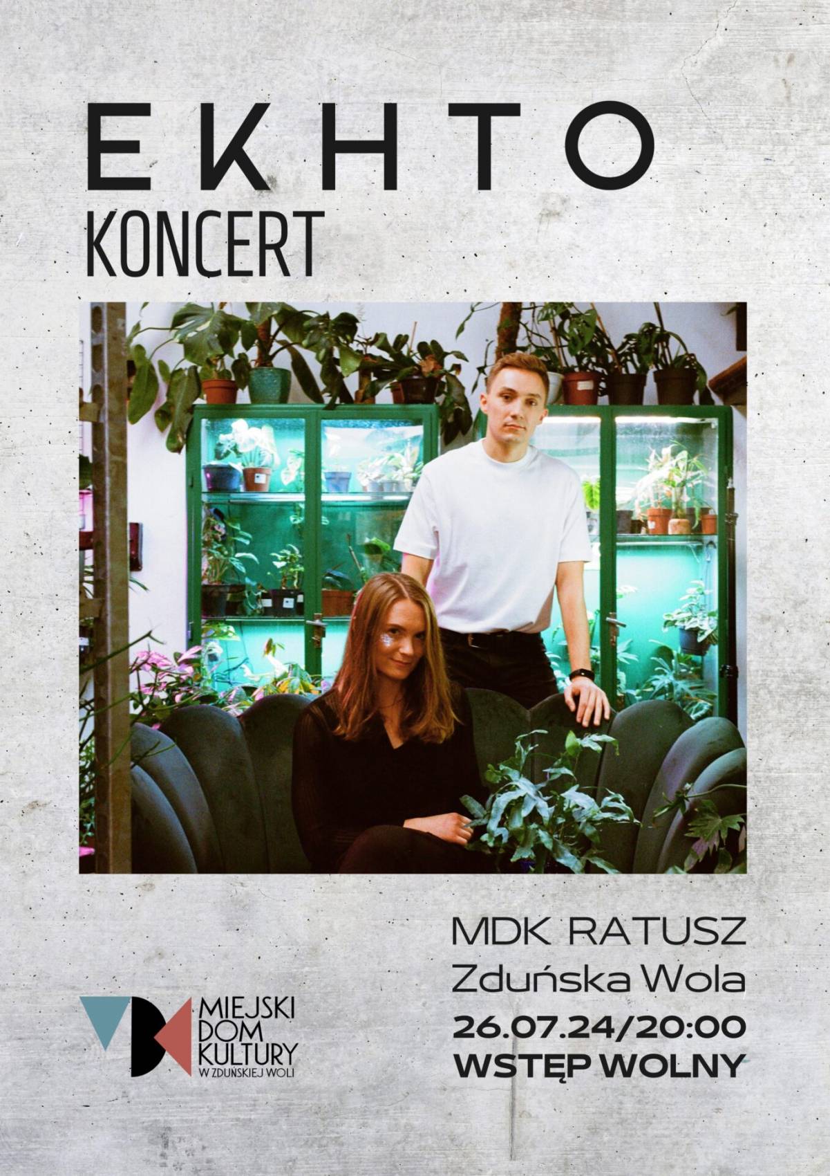 W Miejskim Domu Kultury Ratusz w Zduńskiej Woli w piątek, 26 lipca, zagra alternatywny duet wykonujący muzykę elektroniczną: Anita Barton i Kuba Iwanejko, czyli EKHTO. Początek koncertu o godz. 20. Koncert jest bezpłatny.