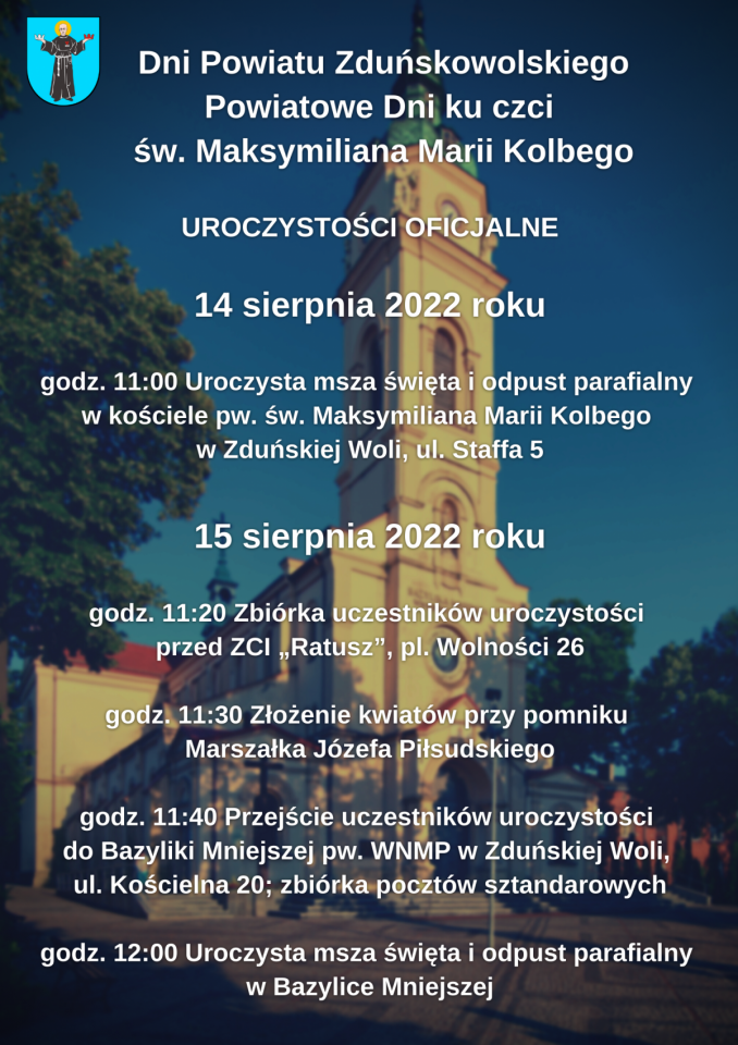 Program Dni Powiatu – Powiatowych Dni ku czci św. Maksymiliana Marii Kolbego obejmuje tradycyjnie uroczystości religijno-patriotyczne oraz imprezy kulturalne. Piknik z okazji Dni Powiatu Zduńskowolskiego jest imprezą integrującą o charakterze kulturalno-rozrywkowym, która łączy pokolenia. Zapewnia mieszkańcom Powiatu Zduńskowolskiego i regionu mnóstwo atrakcji oraz niezapomnianych wrażeń. Podczas Dni Powiatu zaprezentowane zostanie dziedzictwo kulturowe: folklor, sztuki muzyczne i wizualne.