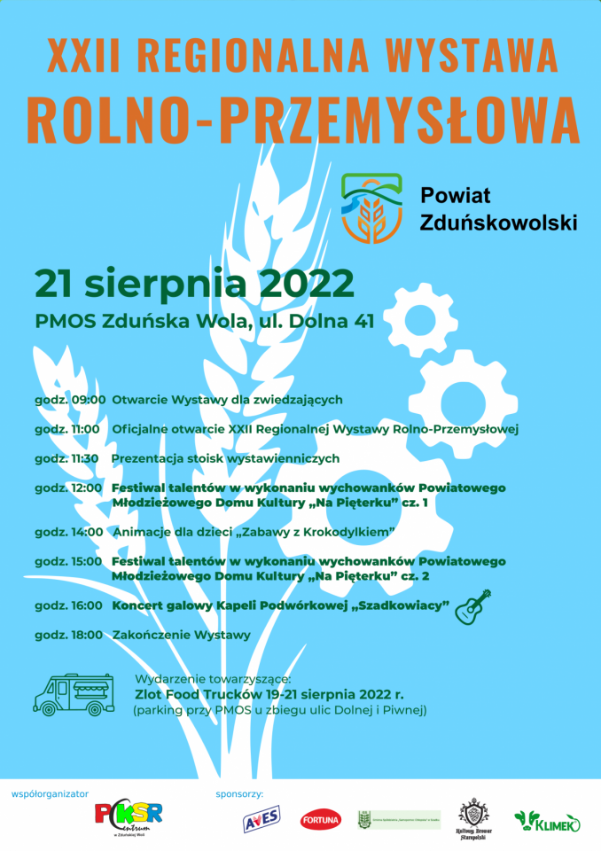 21 sierpnia odbędzie się XXII Regionalna Wystawa Rolno-Przemysłowa. Odwiedzający stoiska wystawiennicze będą mogli zapoznać się z ofertą kilkudziesięciu przedsiębiorców i usługodawców. Wystawa stanowi dla firm związanych z technologiami, przemysłem, budownictwem, rękodziełem, rolnictwem i przetwórstwem okazję do zaprezentowania swoich produktów, nawiązania kontaktów czy też zawarcia kontraktów handlowych. Wystawa Rolno-Przemysłowa, jako impreza wystawiennicza, promuje krajowych i lokalnych przedsiębiorców oraz wytwórców. Wydarzenie ma także komponent rozrywkowy – przygotowaliśmy liczne atrakcje, na plenerowej scenie zaprezentują się m.in. lokalni artyści.