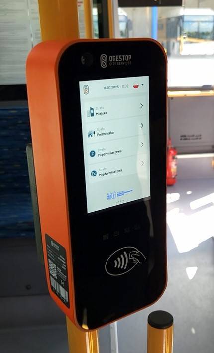 Po wejściu do autobusu terminala trzeba szukać w jego środkowej części. Na panelu wybrać trzeba strefę, rodzaj biletu (normalny lub z ulgą), a na koniec przyłożyć kartę zbliżeniową, by zapłacić za przejazd.