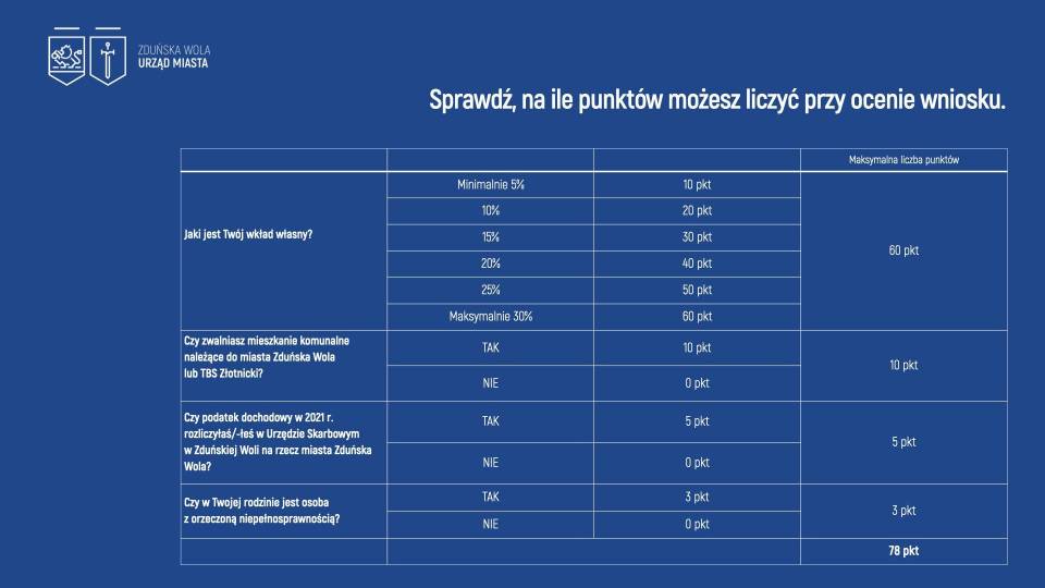 Co jeszcze będzie punktowane? Jeśli wnioskodawca rozliczył w 2021 r. podatek dochodowy w Urzędzie Skarbowym w Zduńskiej Woli na rzecz miasta (a więc podał jako adres zamieszkania Zduńską Wolę), otrzyma 5 pkt. Na dodatkowe 10 pkt mogą liczyć osoby, które zwalniają inne mieszkania należące do TBS Złotnicki lub komunalne od miasta. – W ten sposób odzyskamy do swoich zasobów lokale, które będziemy mogli przekazać innym rodzinom – wyjaśnia prezydent Pokora. Na punkty mogą też liczyć rodziny, w których choć jedna osoba ma orzeczoną niepełnosprawność.