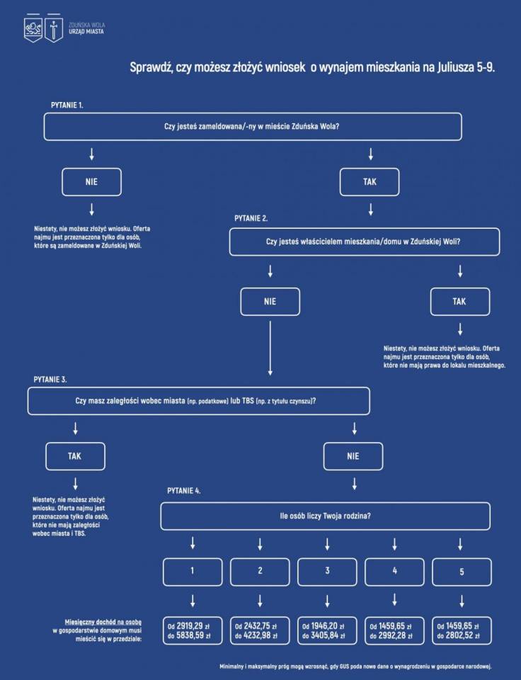 Jakie przyjęto kryteria dochodowe? Podstawą wyliczenia, zgodnie z ustawą, były dane o wynagrodzeniu w gospodarce narodowej. I tak dwuosobowa rodzina będzie mogła wnioskować o mieszkanie na ulicy Juliusza 5-9, jeśli jej dochód na osobę mieści się w przedziale od 2432,75 zł do 4232,98 zł miesięcznie na osobę. Trzyosobowa rodzina musi wykazać dochód od 1946,20 zł do 3405,84 zł, a czteroosobowa – od 1459,65 zł do 2992,28 zł miesięcznie na osobę. W diagramie pod tekstem przedstawiliśmy również wyliczenia dla singla i gospodarstwa czteroosobowego. – W listopadzie br. GUS zaktualizuje dane o wynagrodzeniach i wtedy progi dochodowe zapewne trochę wzrosną, bo płace w Polsce idą w górę – zastrzega prezydent Konrad Pokora.